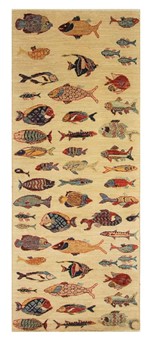Fiskene er hentet fra eldgamle koptiske tekstiler (2-3 århundre) som henger på Musée des Tissus, Lyon og Louvre, Paris. Teppet er knyttet av turkmenere i nordlige Afghanistan. Denne type tepper er laget i eldgammel stil med teknikk og materialer som opprinnelig. Ullen kommer fra utvalgte høyfjellsfjellområder (Ghazni) og er av svært høy kvalitet. Garnet er spunnet for hånd og farget med plantefarger.